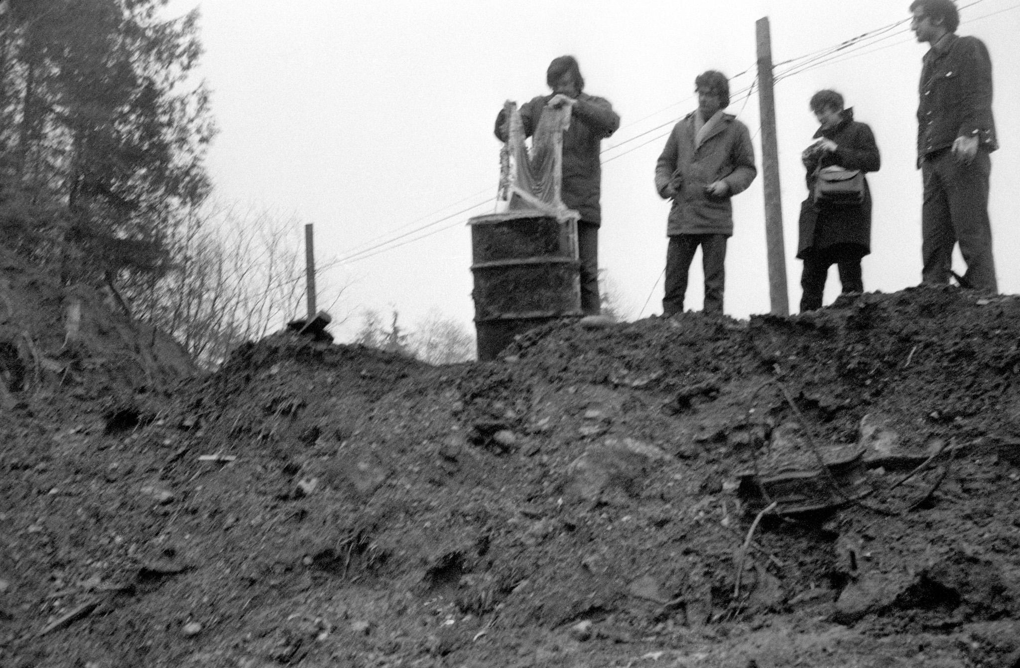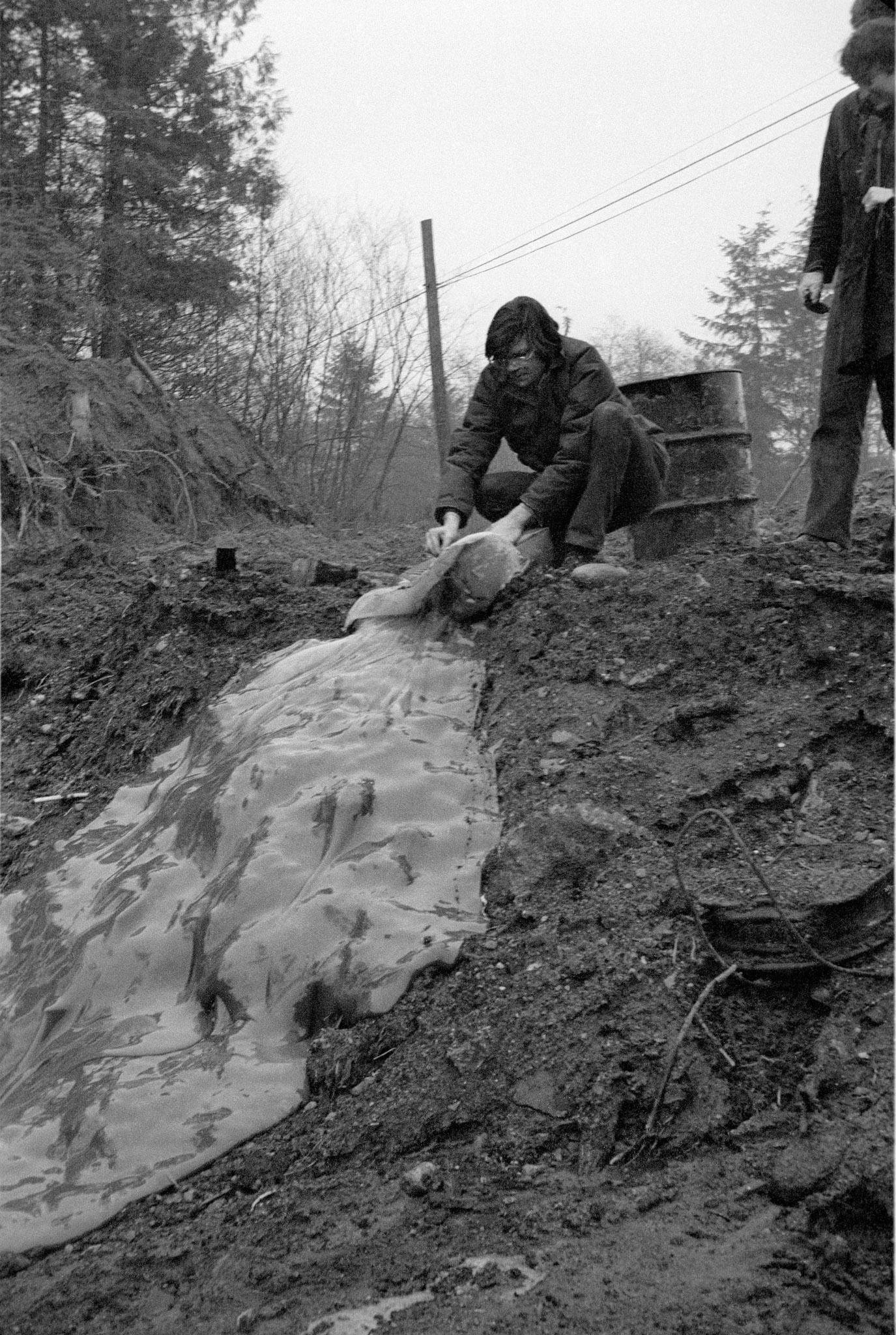 Glue Pour was created for the exhibition 995,000, curated by Lucy Lippard for Vancouver Art Gallery and other sites in the city. It was the second in the “Numbers” series of exhibitions Lippard organized between 1969 and 1973, each titled after the host city’s population. In December 1969 Smithson positioned a large drum of glue at the crest of a hill and tipped the container over, and the orange viscous material followed the contours of the landscape. Photographs of the barrels show the glue was bottle gum, sourced from the Canadian company National Adhesives.